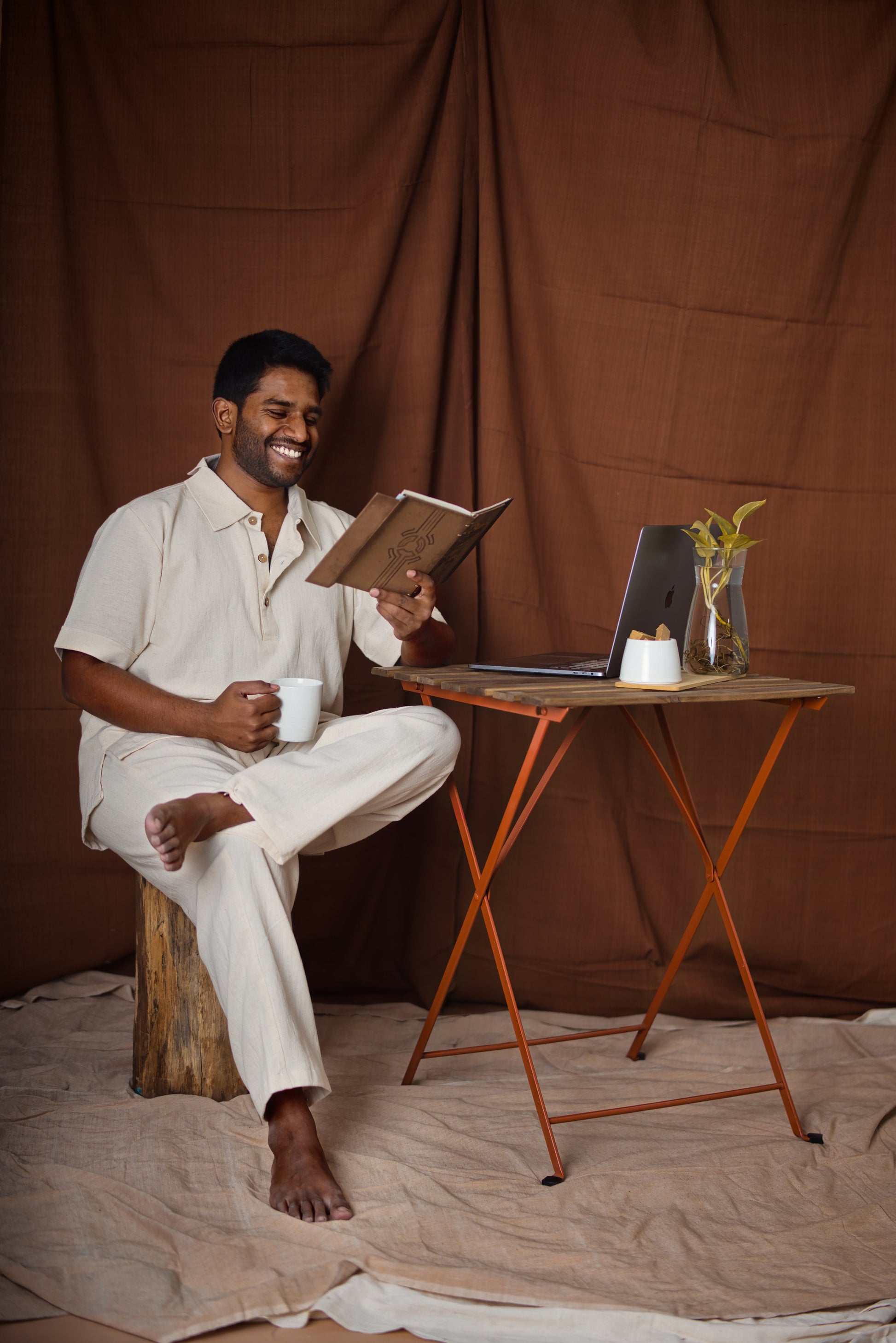 Our depiction of this wfh edition for men shows the joyful side of being at home in PJs and getting ready for video calls in a giffy. Also taking a good reading break while having your afternoon cup of tea